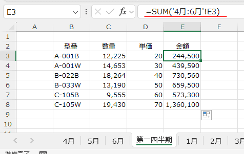 - シート「第1四半期」のE3:E8セルの合計金額も同様に串刺し集計で求めます。