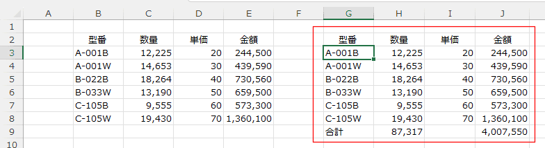 ここのポイントは 選択するセル範囲の左端が B列の品名の列になっていることです。