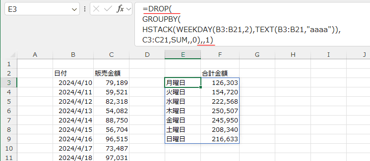 E列の曜日とを比較して、曜日が一致したら、C列の販売金額を合計するという仕組みになっています。