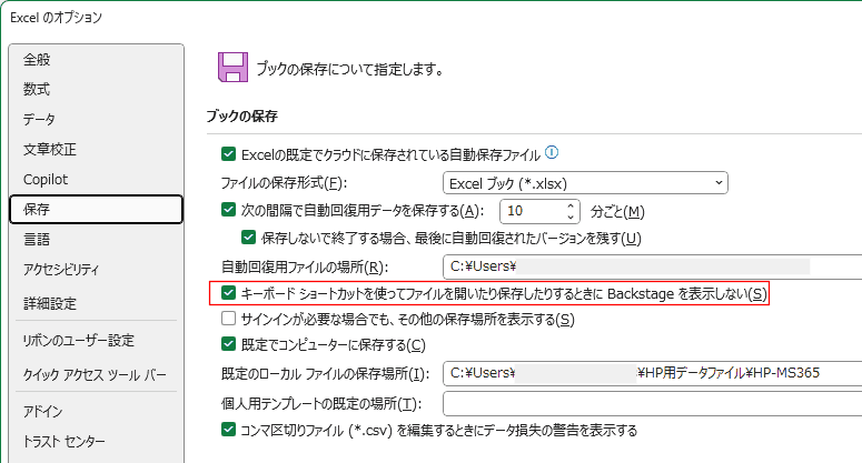 「キーボードショートカットを使ってファイルを開いたり保存したりするときにBackstage を表示しない」にチェックを入れます。