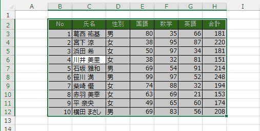 - データリスト内のセルを選択して、[Ctrl]+[A]でデータ範囲を選択します。