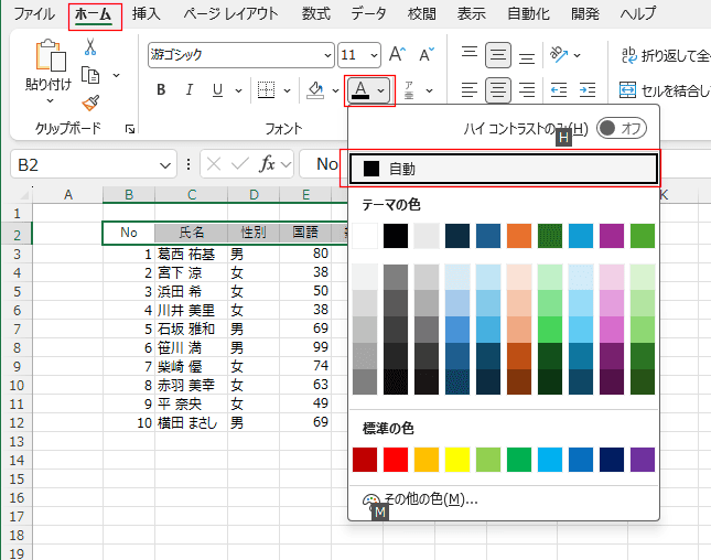 [Alt]、[H]、[FC]、[Enter]で文字色を[自動]としました。