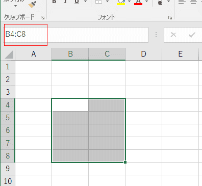 - B4:C8のようにセル範囲を入力すると、その範囲の左上のセルがアクティブな状態で選択できます。
