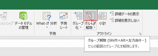 - [データ]タブのアウトライングループにある[グループ解除]ボタンをクリックします。