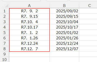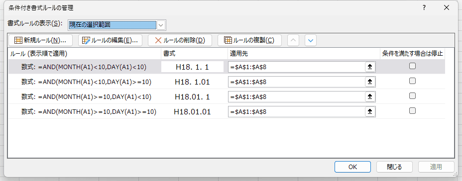 月が1桁 | 日が2桁 | =AND(MONTH(A1)<10,DAY(A1)>=10) | ge._0m.dd |