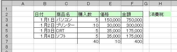 - (例-1) B2:F6に表を作成後、H2セルに『消費税』と入力したら、左側セルの書式(薄い青で塗りつぶす)が設定されてしまいました。