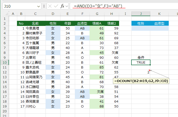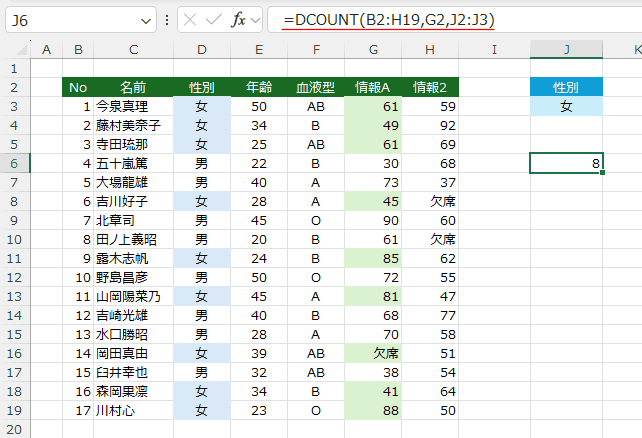 - フィールド名(列見出し)を数式に使うと =DCOUNT(B2:H19,"情報A",J2:J3) となります。
