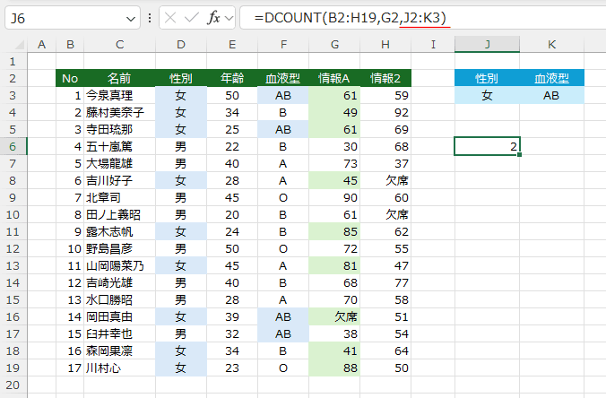 数式は =DCOUNT(B2:H19,G2,J2:K3) としました。