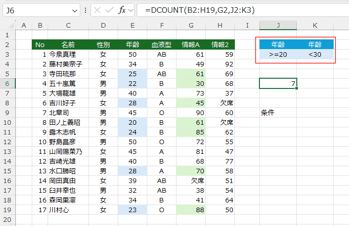 計算式は =DCOUNT(B2:H19,G2,J2:K3) としました。