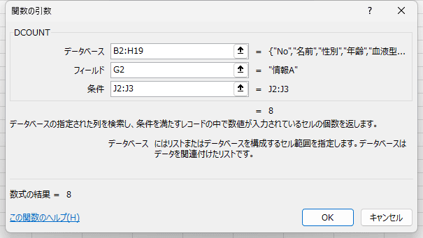 DCOUNT関数の引数のフィールドには "情報A" とフィールド名を入力したり、データベースの列の順番の 6 と入力することもできます。