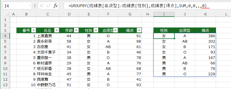 - =GROUPBY(HSTACK(成績表[血液型],成績表[性別]),成績表[得点],SUM,0,0)
