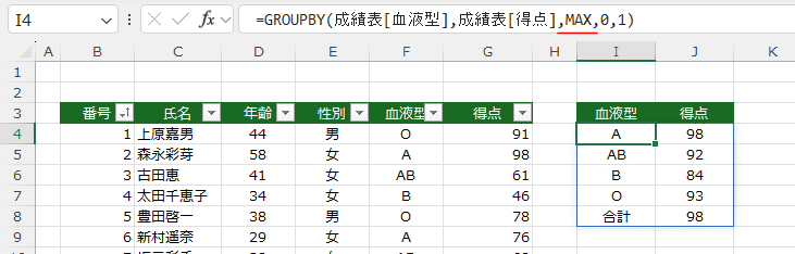 =GROUPBY(成績表[血液型],成績表[得点],LAMBDA(x,MAX(x)),0,1)