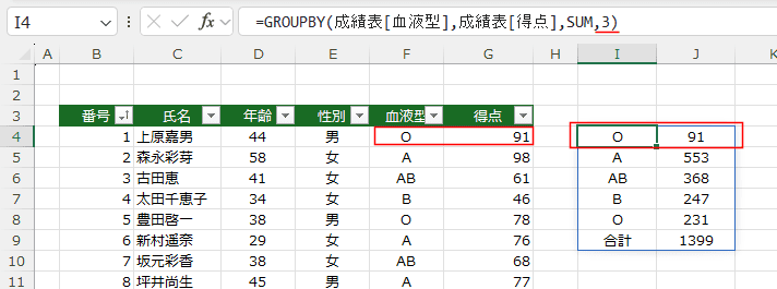 =GROUPBY(成績表[血液型],成績表[得点],SUM,0,0,1)
