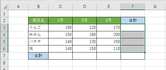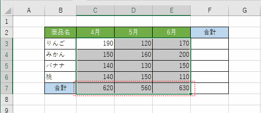 - データが入力されているセル(C3:E6)とその下端行(C7:E7)と右端列(F3:F7)の空白セルを含むセル範囲 C3:F7 を選択します。