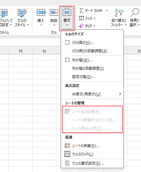 - リボンでは、[ホーム]タブのセル グループの[書式]→[非表示/再表示]→[シートを表示しない]を実行します。