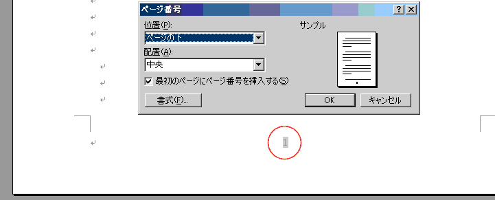 - [ページ番号]ダイアログで「ページの下」「中央」とするとフッターの中央にページ番号が表示されます。