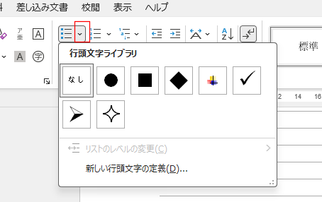 - [ホーム]タブの段落グループの[箇条書き]から適当なデザインを選びます。
