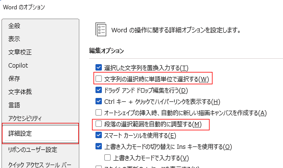 - 文字単位での選択がうまくできない場合、Wordの設定を変更してみます。