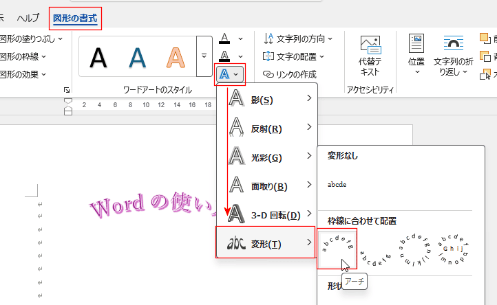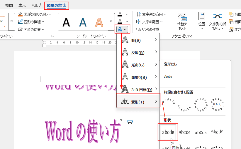 - ワードアートを選択して、[図形の書式]タブを選択します。