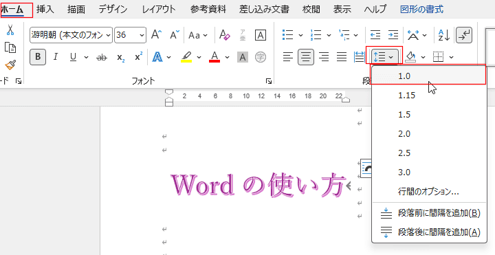 [ホーム]タブでワードアートのフォントサイズが36ポイントであるのを確認します。