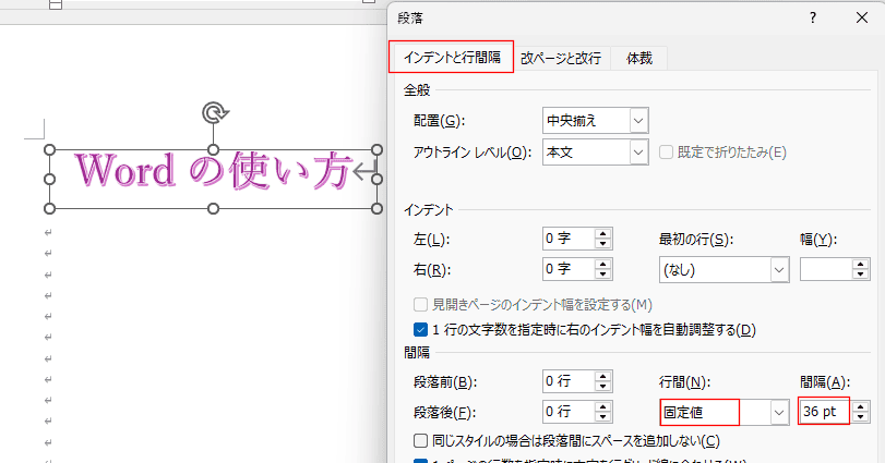 行間を「固定値」にし、間隔を「36 pt」にします。