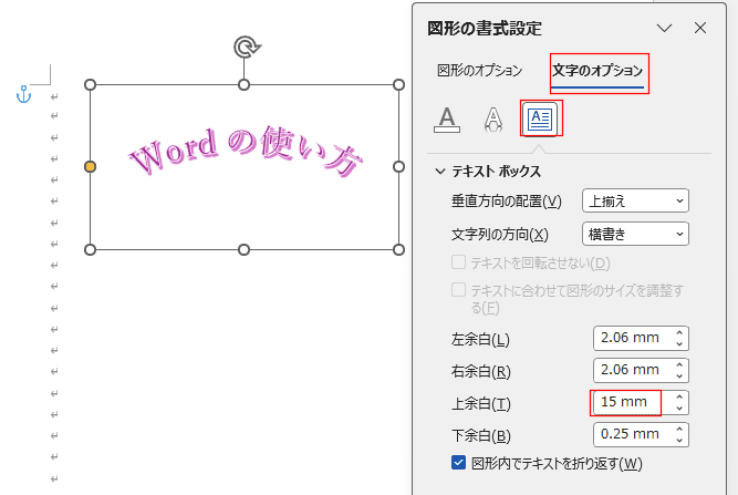 テキストボックスの上余白を「15mm」と広くします。