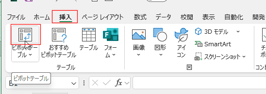 - [挿入]タブの[ピボットテーブル]を実行します。