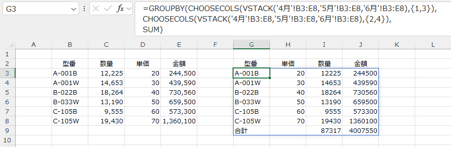 数式バーには =SUM('4月:6月'!C3) と表示されます。