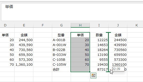 ここのポイントは 選択するセル範囲の左端が B列の品名の列になっていることです。