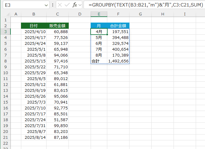 - E3セルに =GROUPBY(TEXT(B3:B21,"m")&"月",C3:C21,SUM) と入力します。