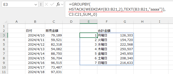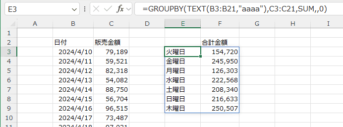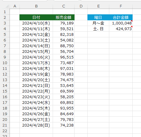 E列の曜日とを比較して、曜日が一致したら、C列の販売金額を合計するという仕組みになっています。