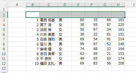 ここでは、B2セルを選択して、[Shift]+[Ctrl]+[→] でB2:H2セルを選択しました。