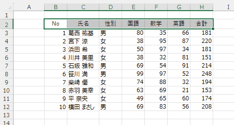 - データリスト内のセルを選択して、[Ctrl]+[A]でデータ範囲を選択します。