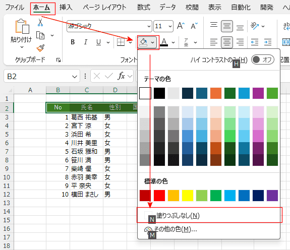 - リボン操作 [ホーム]→[塗りつぶしの色]→[塗りつぶしなし]を実行するアクセスキーです。