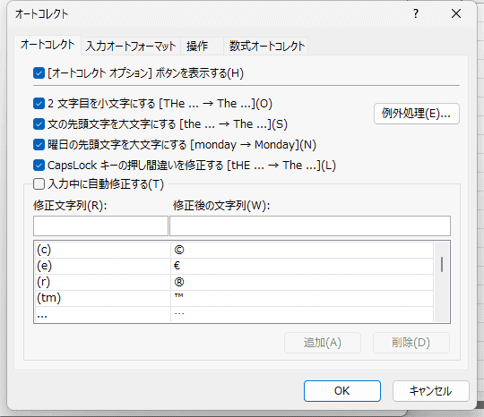 - 『入力中に自動修正する』のチェックをはずします。