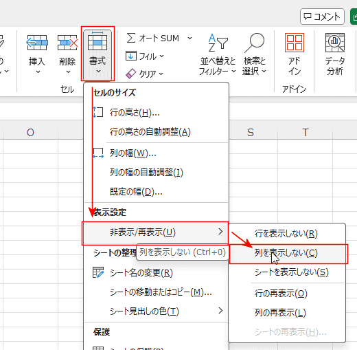 - [ホーム]タブの[書式]→[非表示/再表示]→[列を表示しない]を選択します。