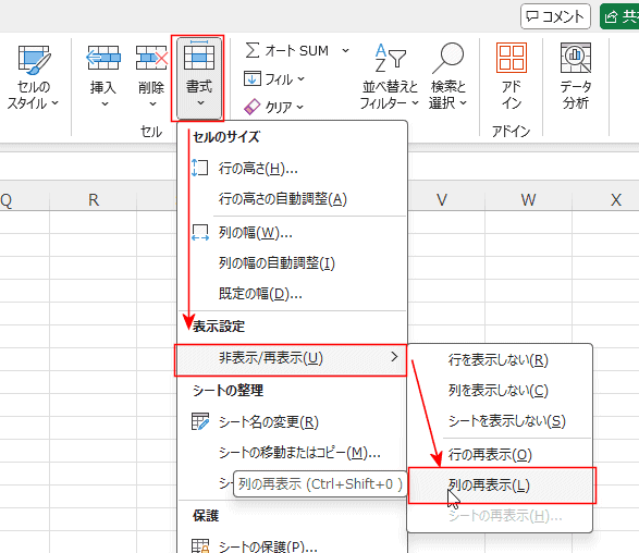 - [ホーム]タブの[書式]→[非表示/再表示]→[列の再表示]を選択します。