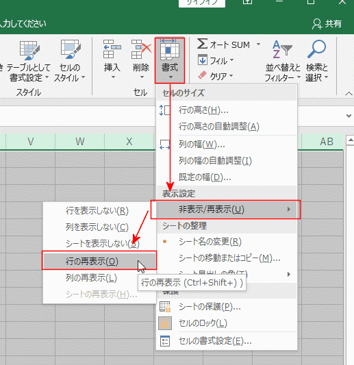 - [ホーム]タブの[書式]→[非表示/再表示]→[行の再表示]を選択します。