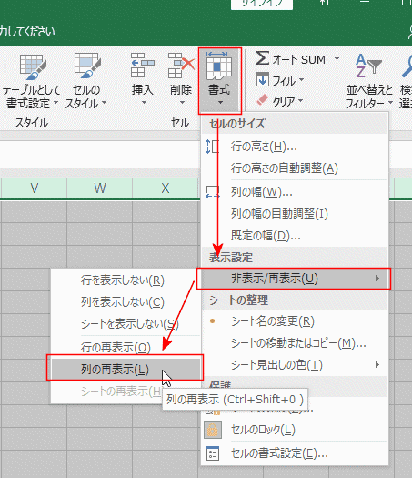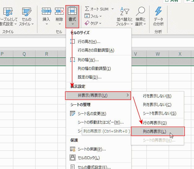- [ホーム]タブのセルグループの[書式]→[非表示/再表示]→[列の再表示]を選択します。