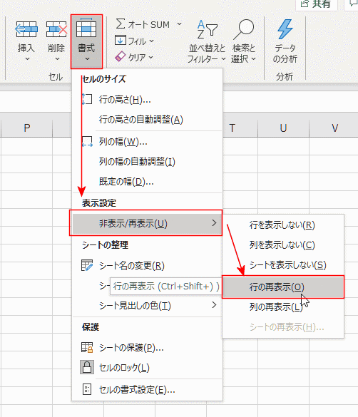 - [ホーム]タブのセルグループの[書式]→[非表示/再表示]→[行の再表示]を選択します。