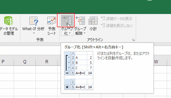 - メニューバーの[データ]タブのアウトライングループにある[グループ化]ボタンをクリックします。