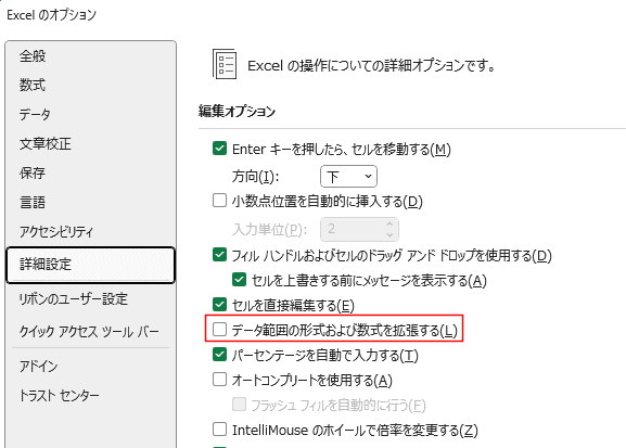 - [詳細設定]を選択し、編集設定で「データ範囲の形式および数式を拡張する」のチェックをはずします。