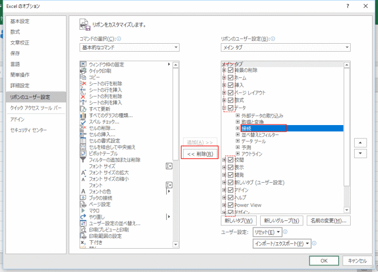 タブ内のグループは選択して[削除]ボタンをクリックすると非表示になります。