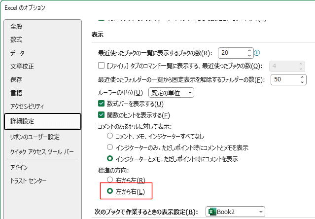 - 表示の標準の方向 で「左から右」にチェックを入れます。