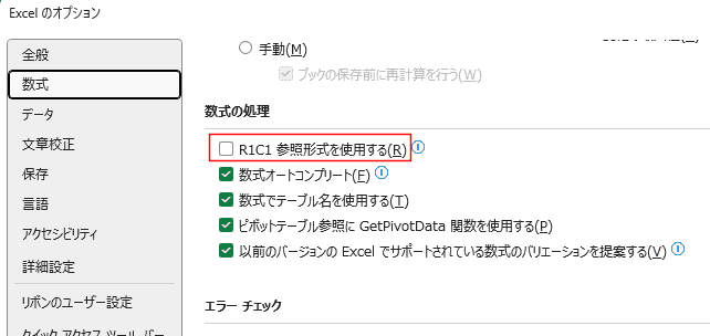 数式の処理で 「R1C1参照形式を使用する。」のチェックをはずします。