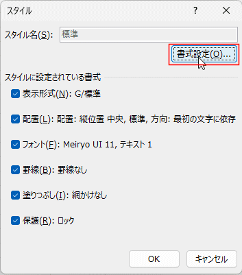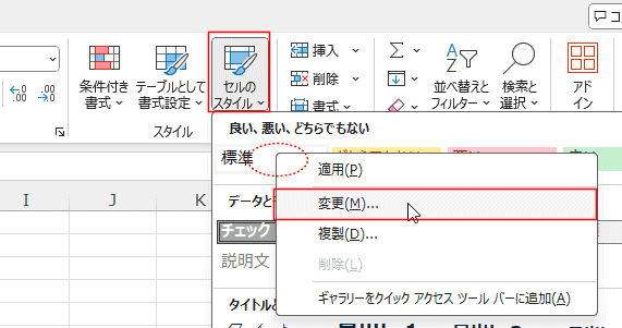 - [ホーム]タブの[セルのスタイル]をクリックして、[標準]を右クリックして[変更]を選択します。