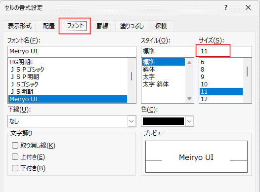 - 「フォント」タブで「サイズ」を既定値の 11 に変更します。