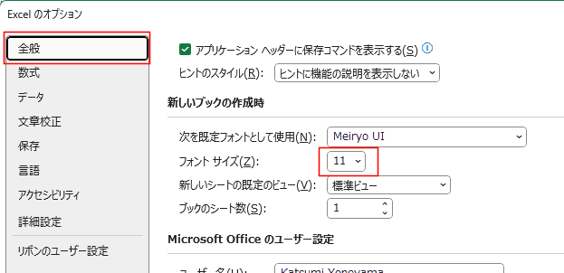 新しいブックの作成時のフォントサイズを 11 (既定値)にします。。