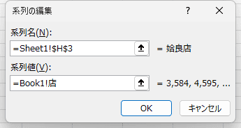 系列値に =Book1!店 と設定します。ファイル名(Book1!)を前に記述します。