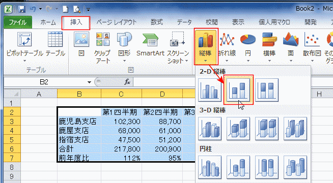 - セル範囲B2:F7を選択し、[挿入]タブのグラフグループにある[縦棒]→[2-D縦棒の積み上げ縦棒]を実行します。